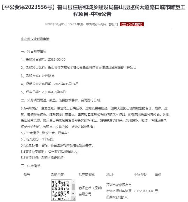 中國政府采購網(wǎng)公開的中標公告顯示,這座位于魯山縣迎賓大道路口城市雕塑工程項目,中標金額達到715.2萬元,資金情況為“財政資金,已落實”。