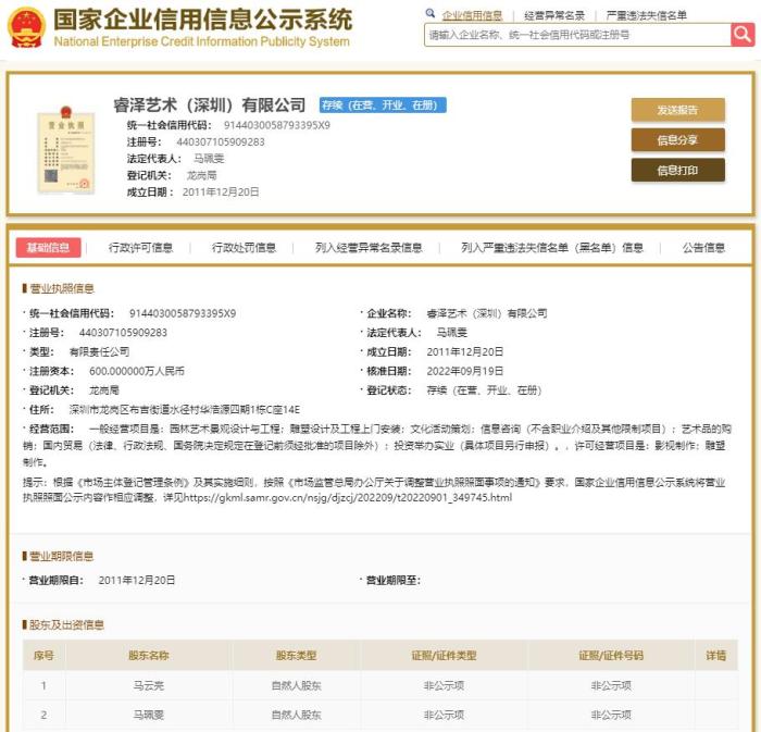 國家企業(yè)信用信息公示系統(tǒng)顯示,睿澤藝術(shù)(深圳)有限公司成立于2011年12月,法定代表人為馬珮雯,注冊資本600萬人民幣。公司由馬云亮、馬珮雯共同持股,馬云亮持股75%,為公司實控人。