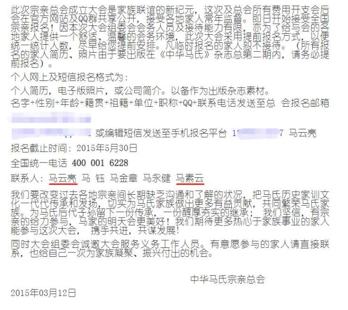 此外,前述“馬氏宗親大會”還包括一位名叫馬素云的聯(lián)系人。