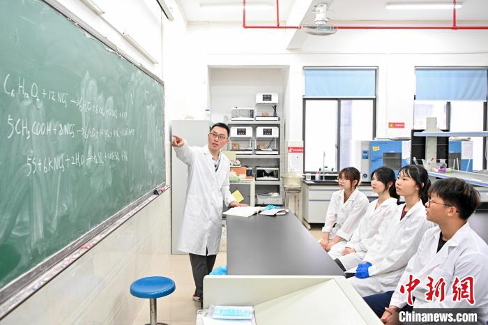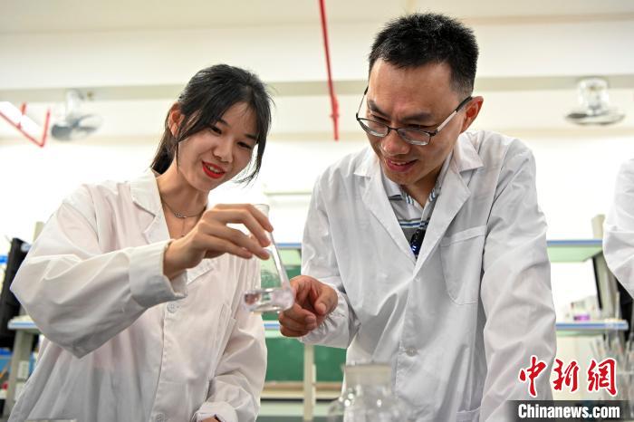 今年6月底,臺(tái)灣教師黃崇輔(右)在肇慶學(xué)院指導(dǎo)學(xué)生做實(shí)驗(yàn)。中新社記者 陳驥旻 攝