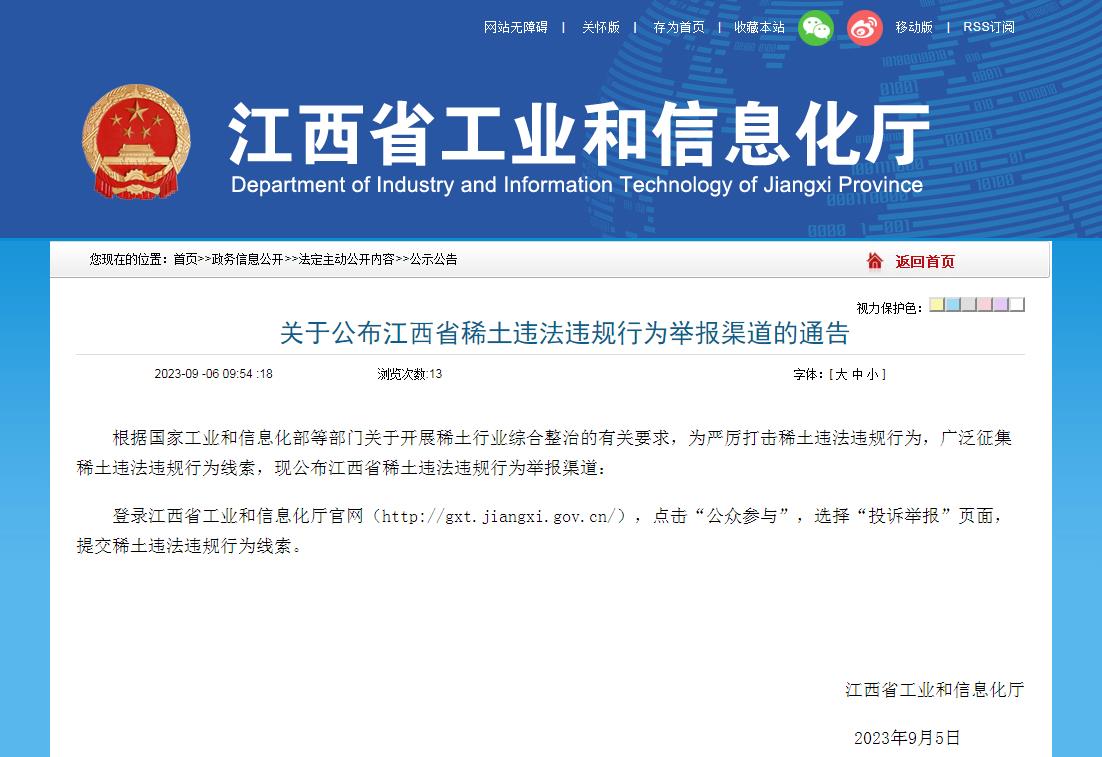 中新網(wǎng)9月6日電 據(jù)江西省工業(yè)和信息化廳官網(wǎng)6日消息,根據(jù)國家工業(yè)和信息化部等部門關(guān)于開展稀土行業(yè)綜合整治的有關(guān)要求,為嚴(yán)厲打擊稀土違法違規(guī)行為,廣泛征集稀土違法違規(guī)行為線索,現(xiàn)公布江西省稀土違法違規(guī)行為舉報渠道:登錄江西省工業(yè)和信息化廳官網(wǎng),點擊“公眾參與”,選擇“投訴舉報”頁面,提交稀土違法違規(guī)行為線索。
