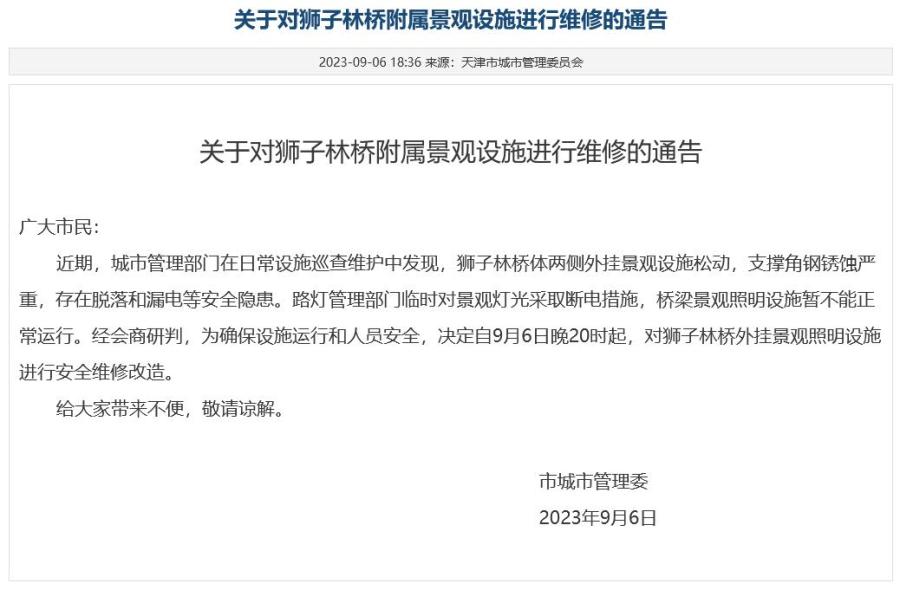 中新網(wǎng)9月7日電 6日,天津市城市管理委員會發(fā)出通告,對獅子林橋附屬景觀設施進行維修。天津市城市管理委表示,近期,城市管理部門在日常設施巡查維護中發(fā)現(xiàn),獅子林橋體兩側外掛景觀設施松動,支撐角鋼銹蝕嚴重,存在脫落和漏電等安全隱患。路燈管理部門臨時對景觀燈光采取斷電措施,橋梁景觀照明設施暫不能正常運行。經(jīng)會商研判,為確保設施運行和人員安全,決定自9月6日晚20時起,對獅子林橋外掛景觀照明設施進行安全維修改造。