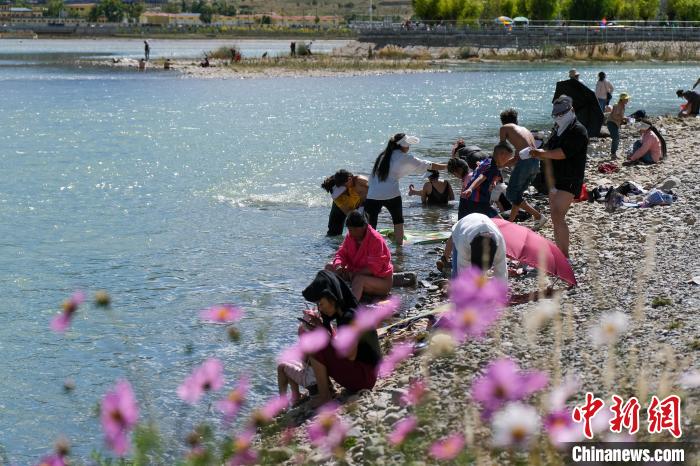 中新社拉薩9月10日電 (記者 江飛波)9月10日是藏歷七月二十六,恰逢周末,西藏民眾迎來(lái)傳統(tǒng)沐浴節(jié)第二天。拉薩河畔格桑花叢中傳出陣陣嬉笑打鬧聲,不少藏族家庭舉家在河畔或梳洗、游泳、跳水、日光浴,或是在河畔一邊閑話,一邊煮著甜茶、牦牛肉等,享受愜意的沐浴節(jié)時(shí)光。