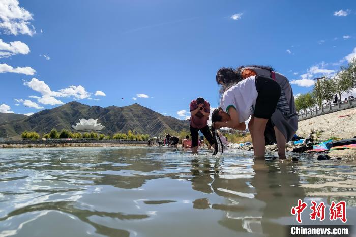 9月10日,民眾在拉薩河畔梳洗。中新社記者 江飛波 攝