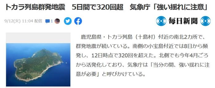 9月8日至12日,日本鹿兒島縣吐噶喇群島持續(xù)發(fā)生地震,5天內(nèi)地震超320次。圖片來源:日本《每日新聞》報道截圖