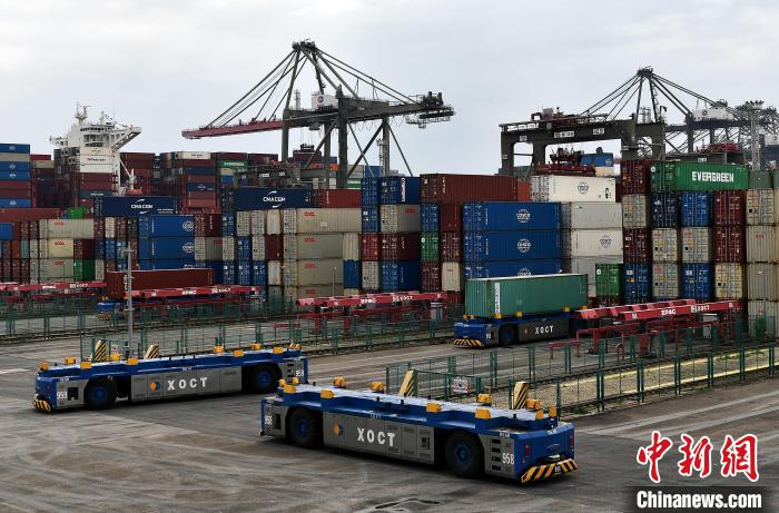 9月7日,廈門遠海自動化碼頭上,轉(zhuǎn)運集裝箱的自動導引車正在作業(yè)。這是全球首個第四代自動化碼頭、中國首個擁有全部自主知識產(chǎn)權(quán)的自動化碼頭,開行了多條“絲路海運”命名航線?!≈行律缬浾?張斌 攝