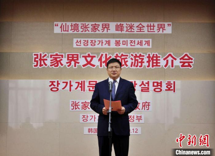 圖為張家界市副市長(zhǎng)楊洪峰致辭。中國(guó)駐首爾旅游辦事處 供圖
