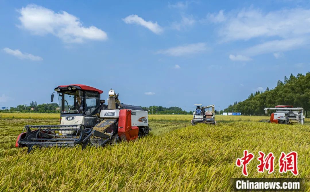 安徽省合肥市廬江縣廣寒村河廣家庭農(nóng)場,農(nóng)機(jī)手操作農(nóng)機(jī)在大田里收割早稻。左學(xué)長 攝