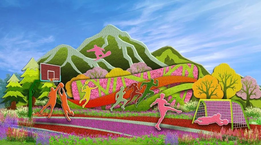 6. 西單東北角的“全民健身”花壇頂高8.5米,以豐富多彩的全民健身為題材,配以籃球、羽毛球、跑步、滑雪等運(yùn)動(dòng)場(chǎng)景,寓意全民健身共享美好生活。