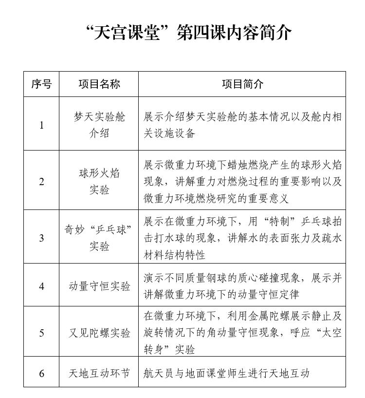 本次太空授課活動(dòng)繼續(xù)采取天地互動(dòng)方式進(jìn)行。3名航天員將在軌展示介紹中國空間站夢天實(shí)驗(yàn)艙工作生活場景,演示球形火焰實(shí)驗(yàn)、奇妙“乒乓球”實(shí)驗(yàn)、動(dòng)量守恒實(shí)驗(yàn)以及又見陀螺實(shí)驗(yàn),并與地面課堂進(jìn)行互動(dòng)交流。
