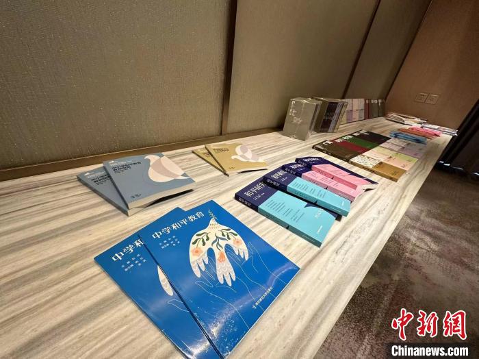 論壇上展示的南京中小學和平教育教材。 申冉 攝