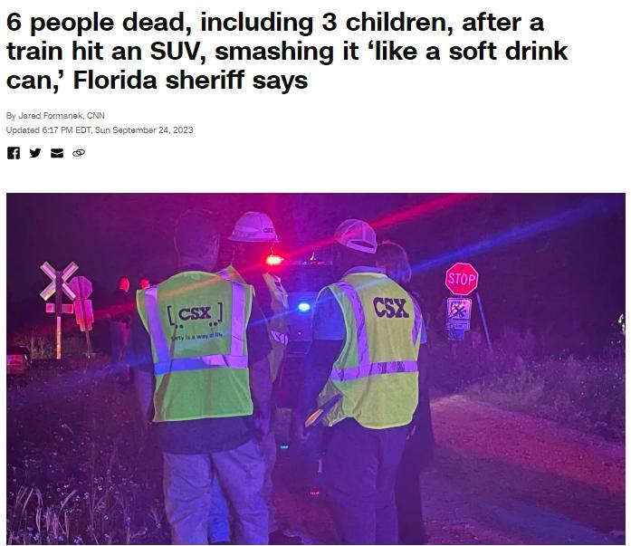 中新網(wǎng)9月25日電 據(jù)美國(guó)有線電視新聞網(wǎng)(CNN)24日?qǐng)?bào)道,當(dāng)?shù)貢r(shí)間23日晚,美國(guó)佛羅里達(dá)州希爾斯伯勒縣一列火車(chē)在經(jīng)過(guò)鐵路口時(shí)與一輛SUV汽車(chē)相撞,造成6人遇難,其中包括3名兒童。