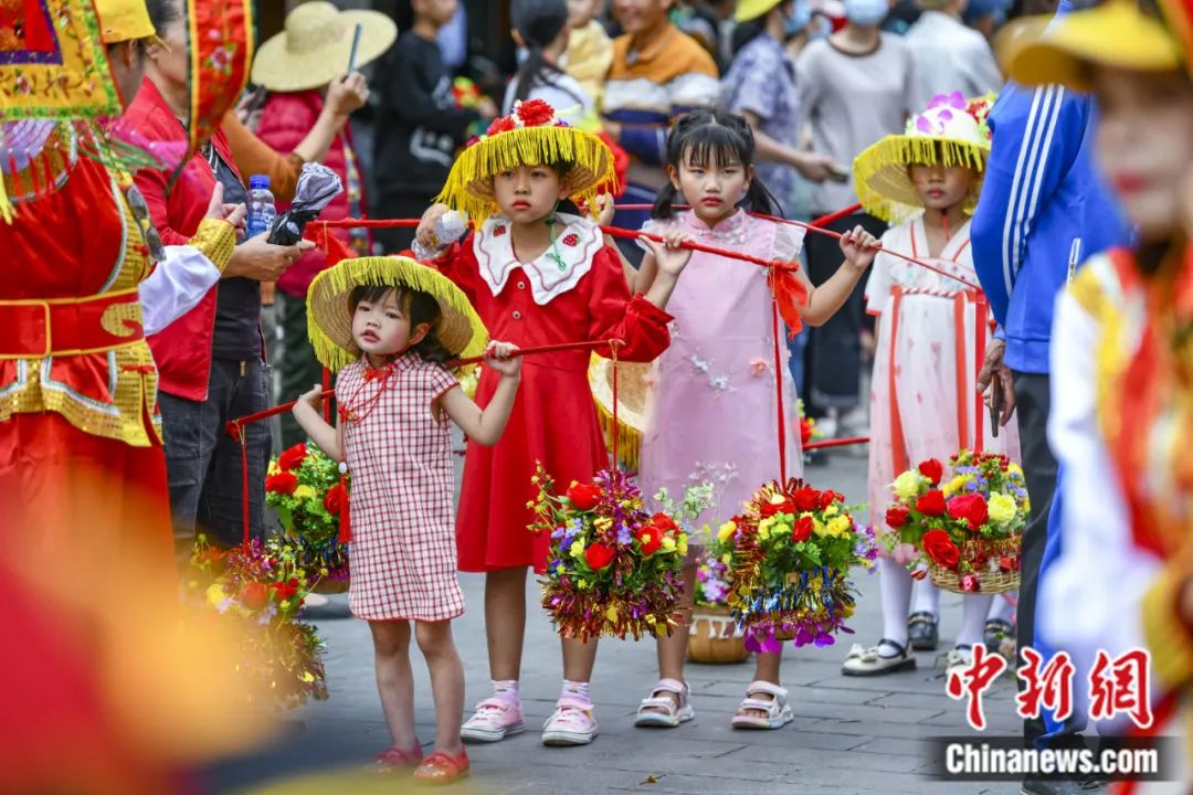 2023年2月28日,第二十二屆??谫蛉宋幕?jié)(原稱軍坡節(jié))之“裝軍巡游”活動在海南海口新坡鎮(zhèn)舉行。圖為在活動中肩挑花籃的小女孩。駱云飛 攝