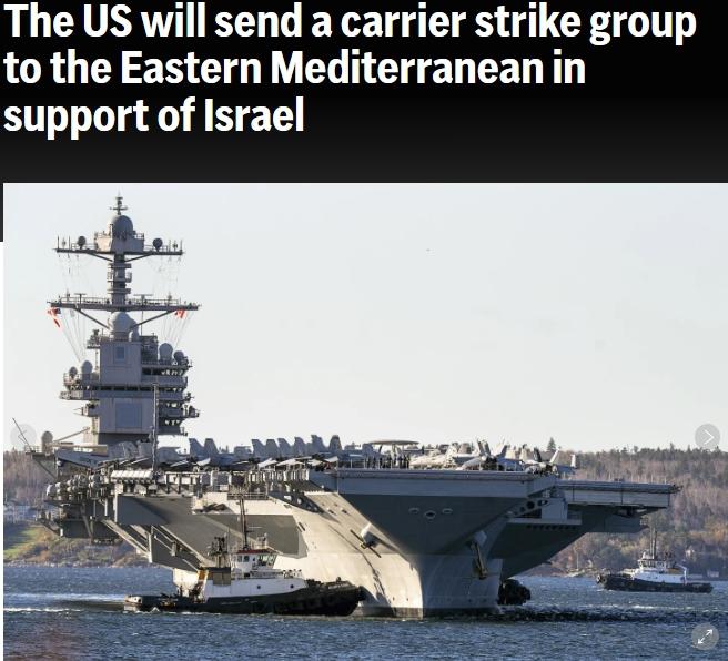 據(jù)美聯(lián)社報道,當天,美國國防部長奧斯汀發(fā)表聲明稱,他下令“杰拉爾德·R·福特”號航空母艦戰(zhàn)斗群移至更靠近以色列的東地中海,包括一艘航空母艦、一艘導彈巡洋艦和四艘導彈驅逐艦,以展示武力,準備應對任何情況,這些情況包括阻止更多武器送達巴勒斯坦伊斯蘭抵抗運動(哈馬斯)以及進行監(jiān)視。