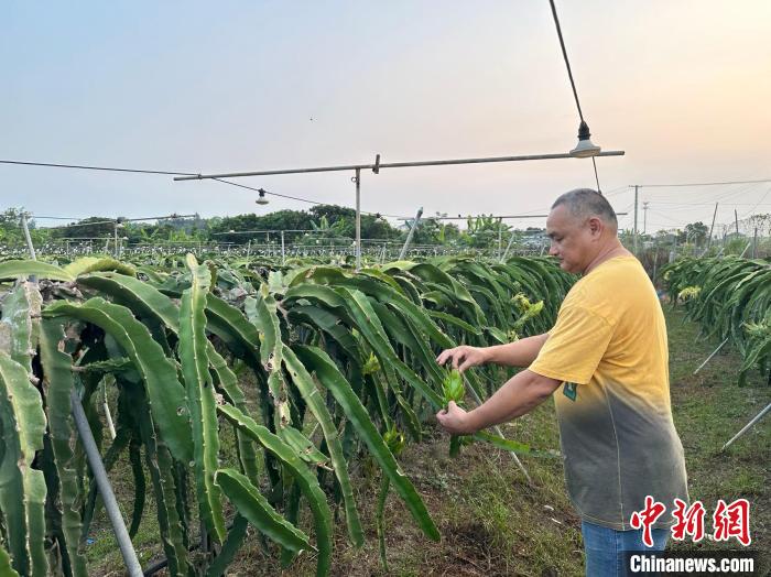 9月,臺(tái)胞曾鈞毅正在查看火龍果生長(zhǎng)情況?!∴嵔?攝