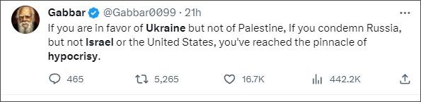 美國合眾國際社(UPI)報道注意到,有很多媒體專欄作者和社交媒體用戶都指出了西方在俄烏沖突等問題上的“虛偽行為”,佩特羅并不是唯一一位。例如一名認(rèn)證為“作家”的社交媒體用戶寫道:“如果你支持烏克蘭而不支持巴勒斯坦,如果你譴責(zé)俄羅斯卻不譴責(zé)以色列或美國,那么你就已經(jīng)達到了虛偽的頂峰。”