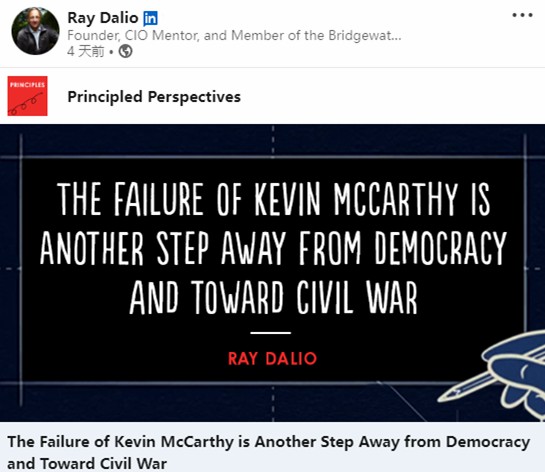 其他人則認為風險要大得多。美國億萬富翁、投資者雷·達里奧(Ray Dalio)6日在其領英(LinkedIn)的帖子中表示,麥卡錫被罷免是美國政治兩極分化加劇的標志,是“遠離民主、走向內戰(zhàn)的又一步”。他還稱,美國國會內斗和極端黨爭可能會造成“非常危險的局面”。