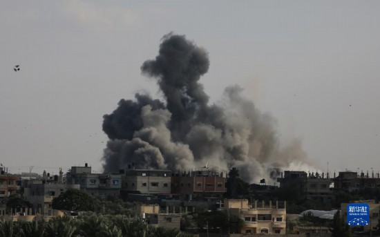 10月10日,在加沙地帶南部城市拉法,以色列空襲后升起濃煙。新華社發(fā)(哈立德·奧馬爾攝)