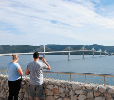 沿著克羅地亞狹長的海岸線一路向南行駛到科馬爾納地區(qū),遠遠就能望見如銀鏈般橫臥在山海之間的佩列沙茨大橋。在橋頭一側(cè)的休息區(qū),人們紛紛停下車來,對著大橋拍照留念。來自克羅地亞北部的卡塞爾和朋友們特地自駕來到這里,開心地請本報記者幫忙合影?!芭辶猩炒拇髽蜻B通了克羅地亞南北領(lǐng)土,是我們心中最美的大橋!”卡塞爾說。