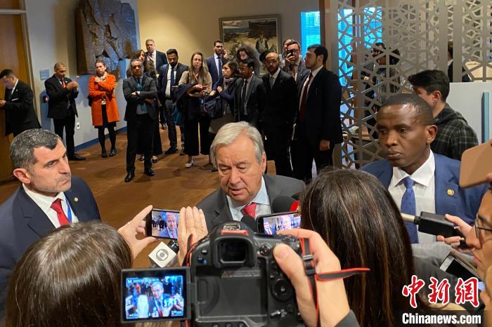 當(dāng)?shù)貢r(shí)間10月13日,聯(lián)合國(guó)秘書長(zhǎng)古特雷斯在安理會(huì)就中東局勢(shì)進(jìn)行緊急磋商后,在紐約聯(lián)合國(guó)總部回答記者提問(wèn)?!≈行律缬浾?王帆 攝