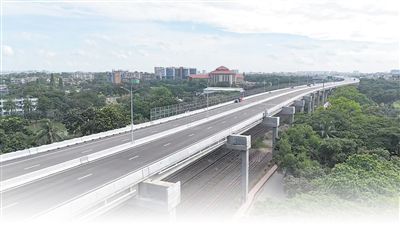 由中國山東高速集團(tuán)主導(dǎo)投資建設(shè)運(yùn)營的孟加拉國首條高架快速路——達(dá)卡機(jī)場高架快速路項(xiàng)目(一期)通車儀式9月2日在孟加拉國首都達(dá)卡舉行。項(xiàng)目通車后極大改善了達(dá)卡市區(qū)交通狀況。圖為孟加拉國達(dá)卡機(jī)場高架快速路項(xiàng)目(一期)遠(yuǎn)景。本報(bào)記者 孫廣勇攝