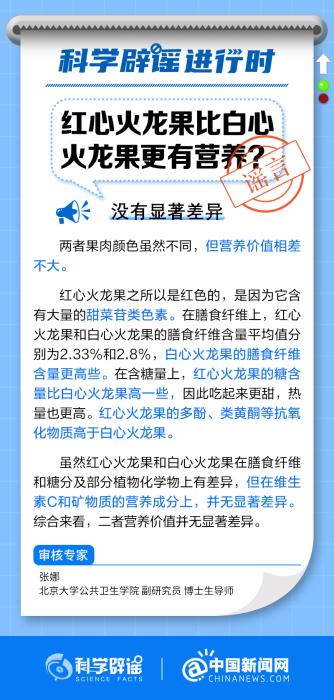中新網(wǎng)10月16日電 在膳食纖維上,白心火龍果的膳食纖維含量更高些;在含糖量上,紅心火龍果的糖含量比白心火龍果高一些,熱量也更高;紅心火龍果的多酚、類黃酮等抗氧化物質(zhì)高于白心火龍果。二者在維生素C和礦物質(zhì)的營養(yǎng)成分上,并無顯著差異。綜合來看,二者營養(yǎng)價(jià)值相差不大。(來源:@科學(xué)辟謠 @中國新聞網(wǎng) )