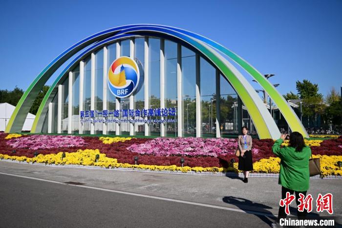 10月15日,北京,工作人員在國(guó)家會(huì)議中心外的第三屆“一帶一路”國(guó)際合作高峰論壇景觀布置前拍照留念。當(dāng)日,位于國(guó)家會(huì)議中心的第三屆“一帶一路”國(guó)際合作高峰論壇新聞中心啟動(dòng)試運(yùn)行。 中新社記者 田雨昊 攝