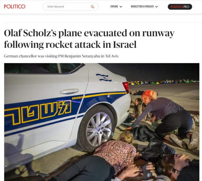 當(dāng)?shù)貢r間17日晚,德國總理朔爾茨在以色列本古里安機(jī)場登機(jī)前突遇火箭彈襲擊,人員緊急躲避。圖片來源:美國政治新聞網(wǎng)報道截圖