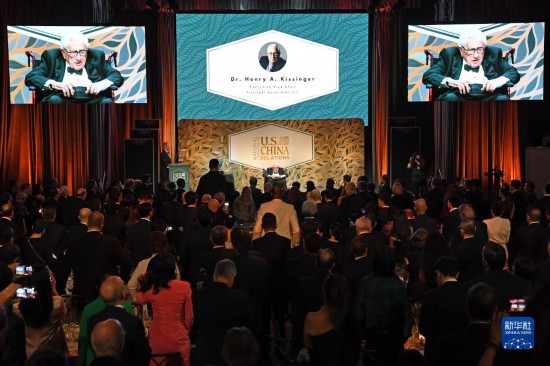 10月24日,美國前國務(wù)卿基辛格(中)出席在紐約舉行的美中關(guān)系全國委員會(huì)年度頒獎(jiǎng)晚宴。新華社記者李睿攝
