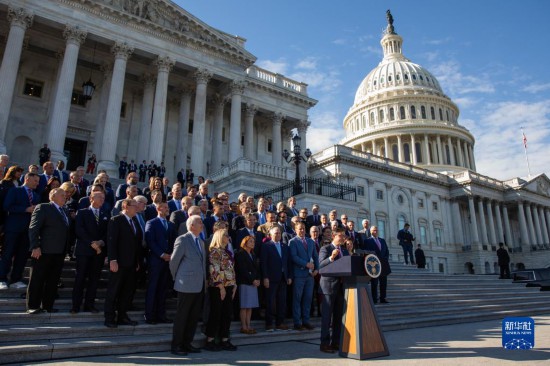 10月25日,在美國華盛頓國會,新當(dāng)選的眾議院議長邁克·約翰遜(后右)發(fā)表講話。新華社發(fā)(亞倫攝)