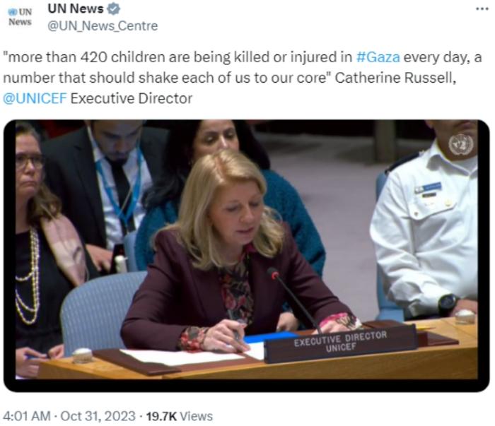 中新網(wǎng)10月31日電 據(jù)聯(lián)合國新聞消息,當(dāng)?shù)貢r(shí)間30日,聯(lián)合國兒童基金會執(zhí)行主任凱瑟琳·拉塞爾表示,最新統(tǒng)計(jì)數(shù)據(jù)顯示,目前加沙地帶每天至少有420名兒童死亡和受傷。