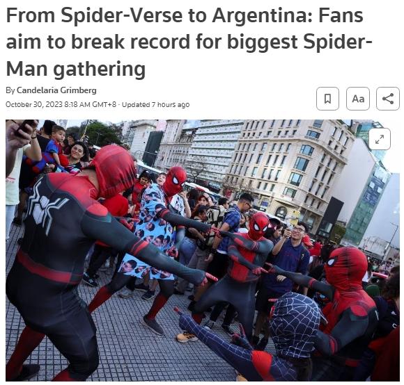 據(jù)報道,阿根廷網(wǎng)紅尤基·丁恩(Uki Deane)通過社交媒體籌辦了這次活動,希望能一舉打破馬來西亞2023年6月創(chuàng)下的685名“蜘蛛俠”齊聚的紀(jì)錄。