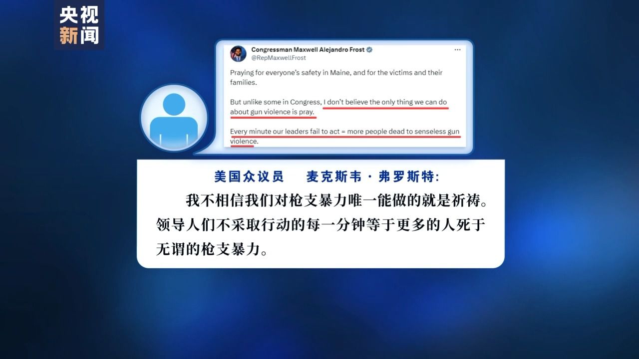 此外,每次槍擊案發(fā)生后,美國擁槍派政客都重復(fù)著空洞的安慰,這次也不例外。在多位擁槍派政客的社交媒體上,各種口頭安慰和無力的陳詞濫調(diào)比比皆是。對此,美國眾議員麥克斯韋·弗羅斯特(Maxwell Alejandro Frost)發(fā)推文寫道,“我不相信我們對槍支暴力唯一能做的就是祈禱。領(lǐng)導(dǎo)人們不采取行動的每一分鐘等于更多的人死于無謂的槍支暴力?!?/p>