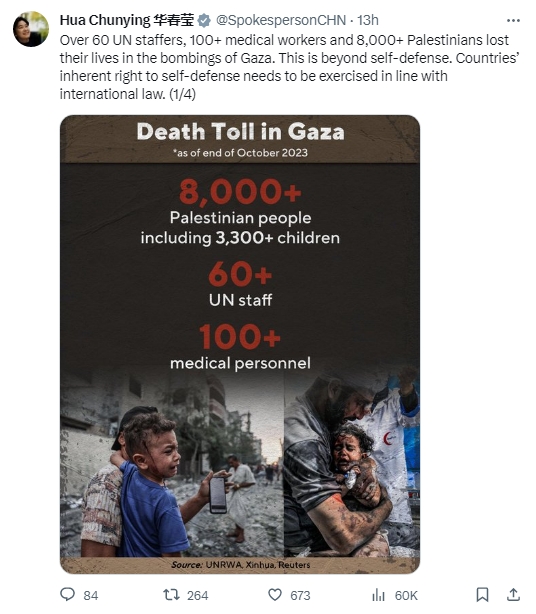 據(jù)報道,當天,華春瑩發(fā)帖提及加沙地帶的人員傷亡。她稱,“超過60名聯(lián)合國工作人員、100名醫(yī)務(wù)工作者、8000名巴勒斯坦人在對加沙的轟炸中喪生。這超出了自衛(wèi)的范圍。各國擁有的自衛(wèi)權(quán)須依據(jù)國際法行使?!?/p>