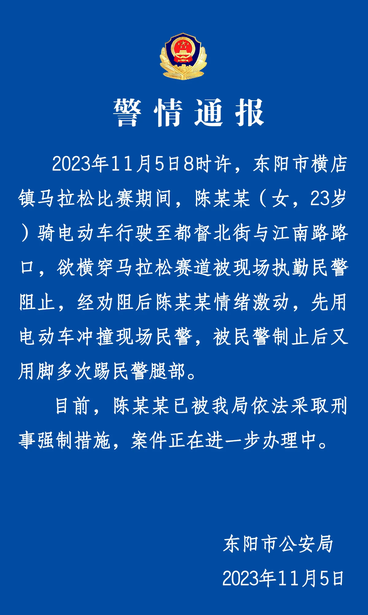 中新網(wǎng)金華11月6日電(董易鑫)浙江金華東陽市公安局11月5日發(fā)布警情通報稱,2023年11月5日8時許,東陽市橫店鎮(zhèn)馬拉松比賽期間,陳某某(女,23歲)騎電動車行駛至都督北街與江南路路口,欲橫穿馬拉松賽道被現(xiàn)場執(zhí)勤民警阻止,經(jīng)勸阻后陳某某情緒激動,先用電動車沖撞現(xiàn)場民警,被民警制止后又用腳多次踢民警腿部。
