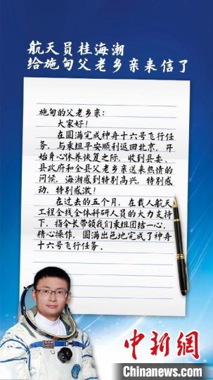 11月4日,桂海潮從北京發(fā)出了給家鄉(xiāng)回信中,他表示,“在過(guò)去的五個(gè)月,在載人航天工程全線全體科研人員的大力支持下,指令長(zhǎng)帶領(lǐng)我們乘組團(tuán)結(jié)一心,精心操作,圓滿出色地完成了神州十六號(hào)飛行任務(wù)?!?/p>
