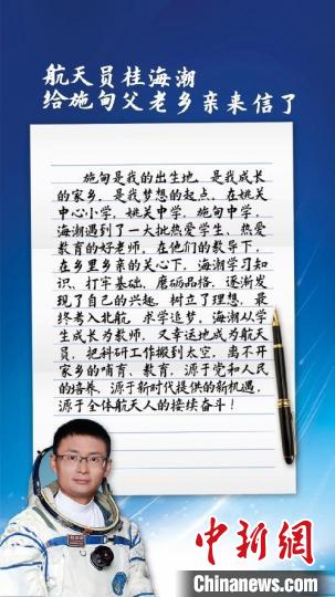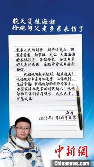 中新網(wǎng)昆明11月5日電(陳靜)記者5日從云南省保山市施甸縣委縣政府獲悉,其收到了航天員桂海潮4日從北京發(fā)來(lái)的回信,他在信中表示,感謝家鄉(xiāng)的哺育,期待恢復(fù)后,回家鄉(xiāng)看看!