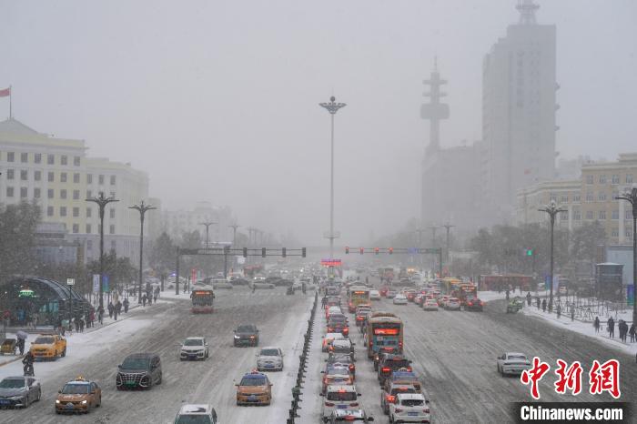 11月6日,哈爾濱市迎來(lái)暴雪天氣,車(chē)輛在結(jié)冰的路面上蝸行。趙宇航 攝