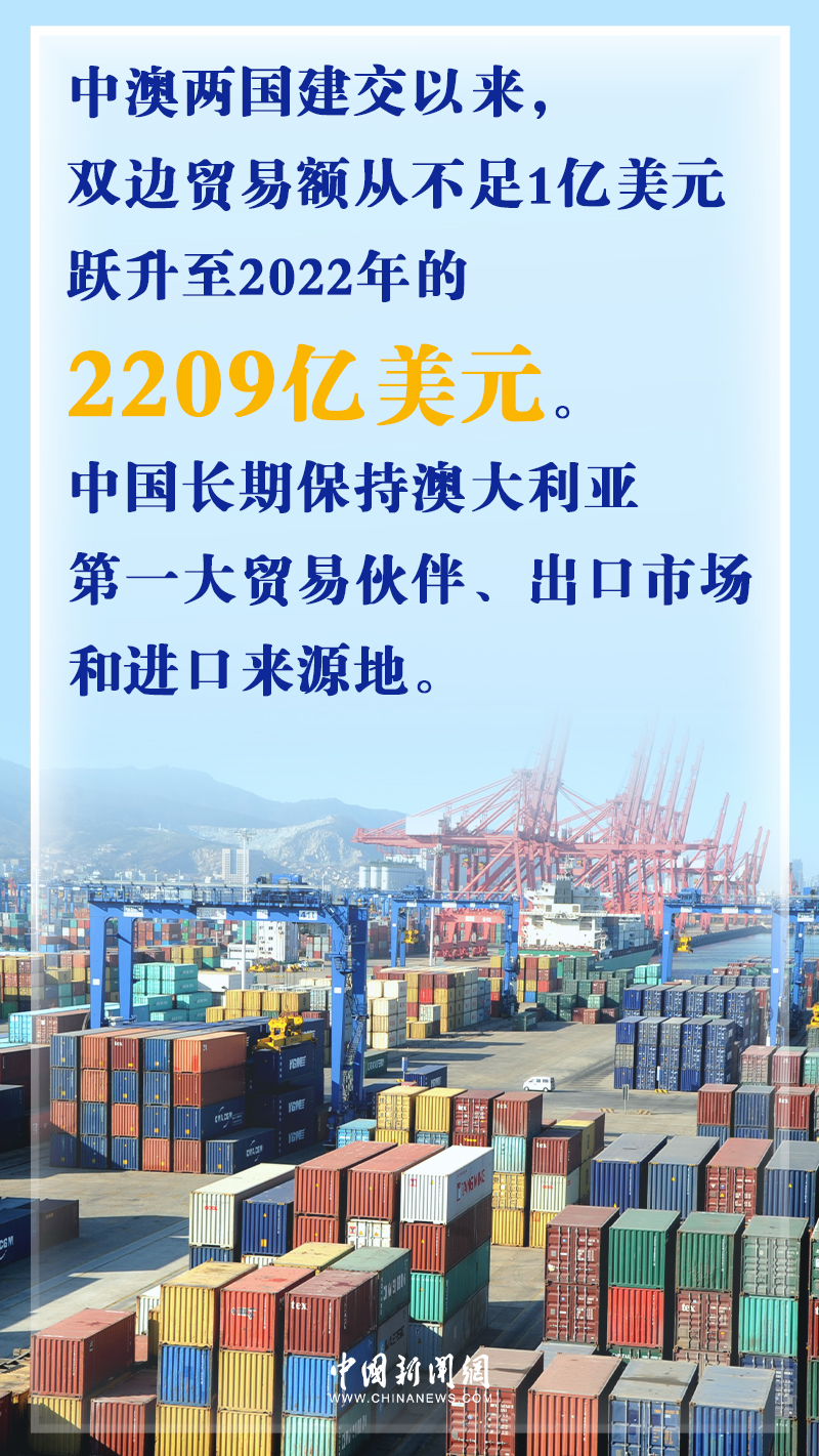據(jù)中國駐澳大利亞大使館網(wǎng)站數(shù)據(jù),中澳兩國建交50年來,雙邊貿(mào)易額從當(dāng)時不足1億美元,躍升至2022年的2209億美元。中國長期保持澳大利亞第一大貿(mào)易伙伴、出口市場和進(jìn)口來源地的地位。與此同時,越來越多的澳大利亞優(yōu)質(zhì)農(nóng)產(chǎn)品走進(jìn)中國家庭,豐富了中國消費(fèi)者的選擇。