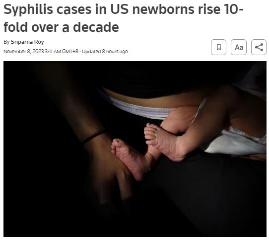據(jù)報(bào)道,當(dāng)天,美國疾病控制和預(yù)防中心報(bào)告顯示,2012年新生兒梅毒病例僅為330多例2022年這一數(shù)字升至3761例,增長了10倍多,為30多年來最高值。