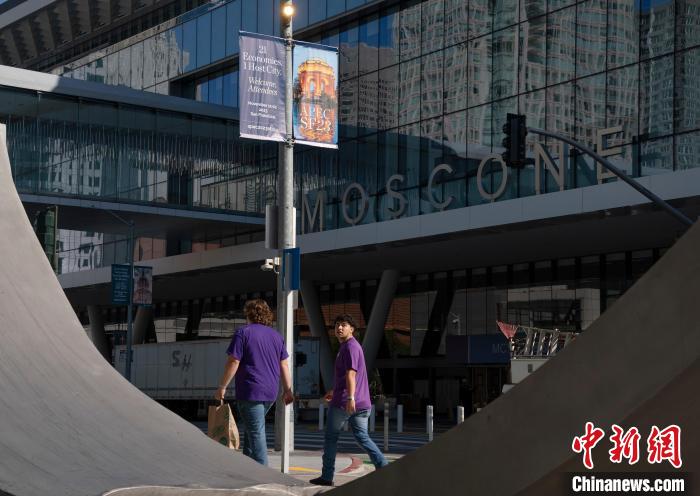 當?shù)貢r間11月7日,民眾從舊金山莫斯康中心附近經(jīng)過?!≈行律缬浾? 劉關(guān)關(guān) 攝