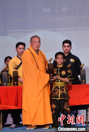 當?shù)貢r間11月12日下午,由中國嵩山少林寺主辦的“不朽少林”少林功夫公演在已有逾百年歷史的美國洛杉磯Million Dollar劇院舉行。圖為嵩山少林寺方丈釋永信向“北美洲少林考功大賽”獲獎?wù)哳C獎?!≈行律缬浾? 張朔 攝