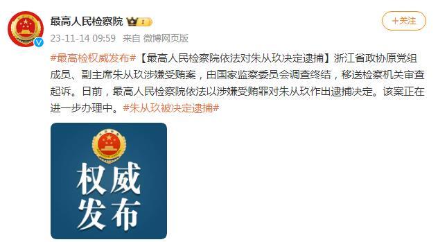 中新網(wǎng)11月14日電 據(jù)最高人民檢察院官方微博消息,浙江省政協(xié)原黨組成員、副主席朱從玖涉嫌受賄案,由國家監(jiān)察委員會調(diào)查終結(jié),移送檢察機(jī)關(guān)審查起訴。日前,最高人民檢察院依法以涉嫌受賄罪對朱從玖作出逮捕決定。該案正在進(jìn)一步辦理中。