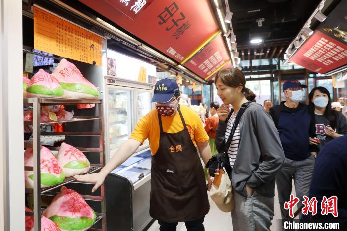正式開(kāi)張首日,各攤商早早地布置好店面。記者在市場(chǎng)一樓看到,立家湖州粽店的粽子等美食香氣四溢,購(gòu)買(mǎi)民眾排起長(zhǎng)隊(duì);合興糕團(tuán)店的巨大壽桃上有“福”“祿”“生日快樂(lè)”等字,吸引顧客拍照;大連食品店整齊擺著各類(lèi)堅(jiān)果,并掛著湖南臘腸、廣東臘肉等熟食。