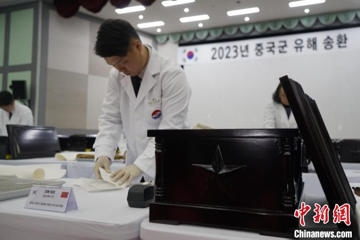 當(dāng)?shù)貢r(shí)間11月22日上午,第十批在韓中國(guó)人民志愿軍烈士遺骸裝殮儀式在韓國(guó)舉行。圖為韓方工作人員對(duì)志愿軍烈士遺骸進(jìn)行裝殮。中新社記者 劉旭 攝