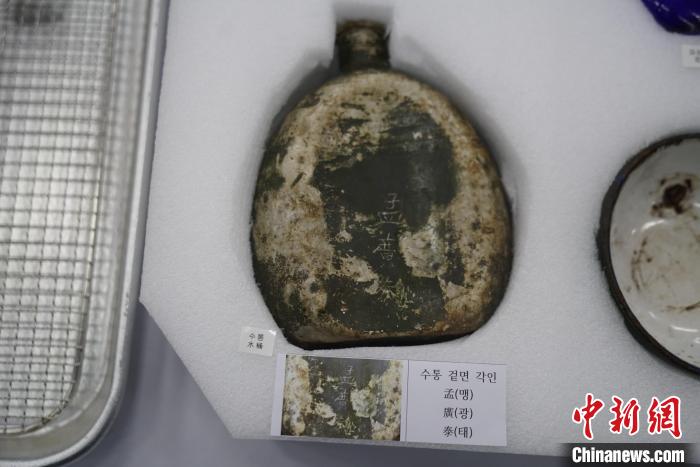 當(dāng)?shù)貢r(shí)間11月22日上午,第十批在韓中國(guó)人民志愿軍烈士遺骸裝殮儀式在韓國(guó)舉行。圖為裝殮儀式現(xiàn)場(chǎng)拍攝的寫(xiě)有“孟廣泰”名字的水壺。中新社記者 劉旭 攝