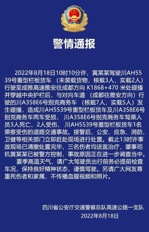 2022年8月18日10時(shí)10分許,G5京昆高速公路成雅段K1868公里+150米路段(成都市蒲江縣境內(nèi))發(fā)生川 AH55**貨車沖斷中央護(hù)欄與對向正常行駛的川A35***小客車發(fā)生碰撞,造成小客車內(nèi)3人當(dāng)場死亡,小客車內(nèi)2人和大貨車內(nèi)1人受傷、2車及高速公路路產(chǎn)受損的道路交通事故,直接經(jīng)濟(jì)損失約350萬元。