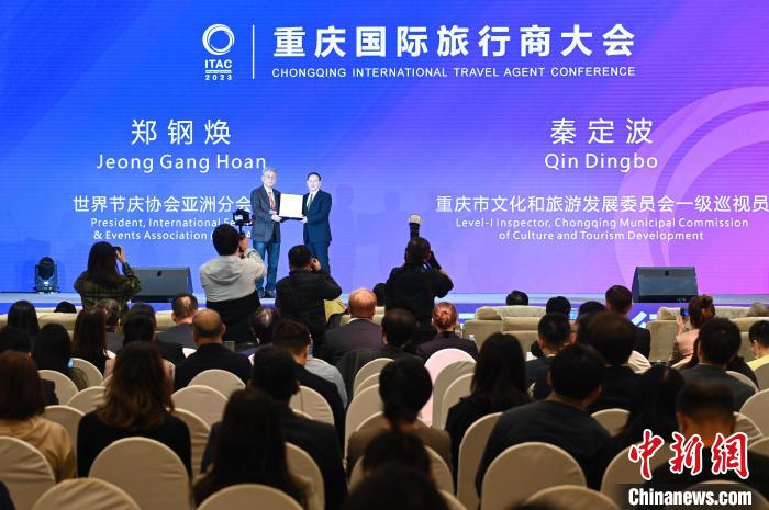 世界節(jié)慶協(xié)會(huì)亞洲分會(huì)會(huì)長鄭鋼煥為重慶市頒發(fā)“2023亞太旅游節(jié)慶城市”獎(jiǎng)。中新網(wǎng)記者何蓬磊攝