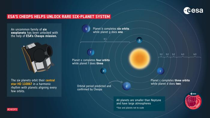 美國國家航空航天局(NASA)的“凌日系外行星巡天衛(wèi)星”(TESS)在2020年和2022年觀測 HD110067,發(fā)現該恒星亮度的數次下降,加之來自“系外行星特性探測衛(wèi)星”(CHEOPS)的更多觀測,論文第一作者和通訊作者、美國芝加哥大學R. Luque與同事及合作者研究認為,這些跡象可解釋為6顆行星從恒星前面經過。通過研究3顆最深處行星,他們計算了所有6顆行星的軌道,從最深處的約9天,到最外層的約54天。