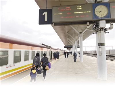 由中國(guó)路橋工程有限責(zé)任公司承建的蒙內(nèi)鐵路是肯尼亞獨(dú)立以來建設(shè)的首條鐵路,也是一條采用中國(guó)標(biāo)準(zhǔn)、中國(guó)技術(shù)、中國(guó)裝備建造的現(xiàn)代化鐵路,被譽(yù)為中國(guó)和肯尼亞共建“一帶一路”標(biāo)志性工程。圖為蒙內(nèi)鐵路列車??吭趦?nèi)羅畢站。